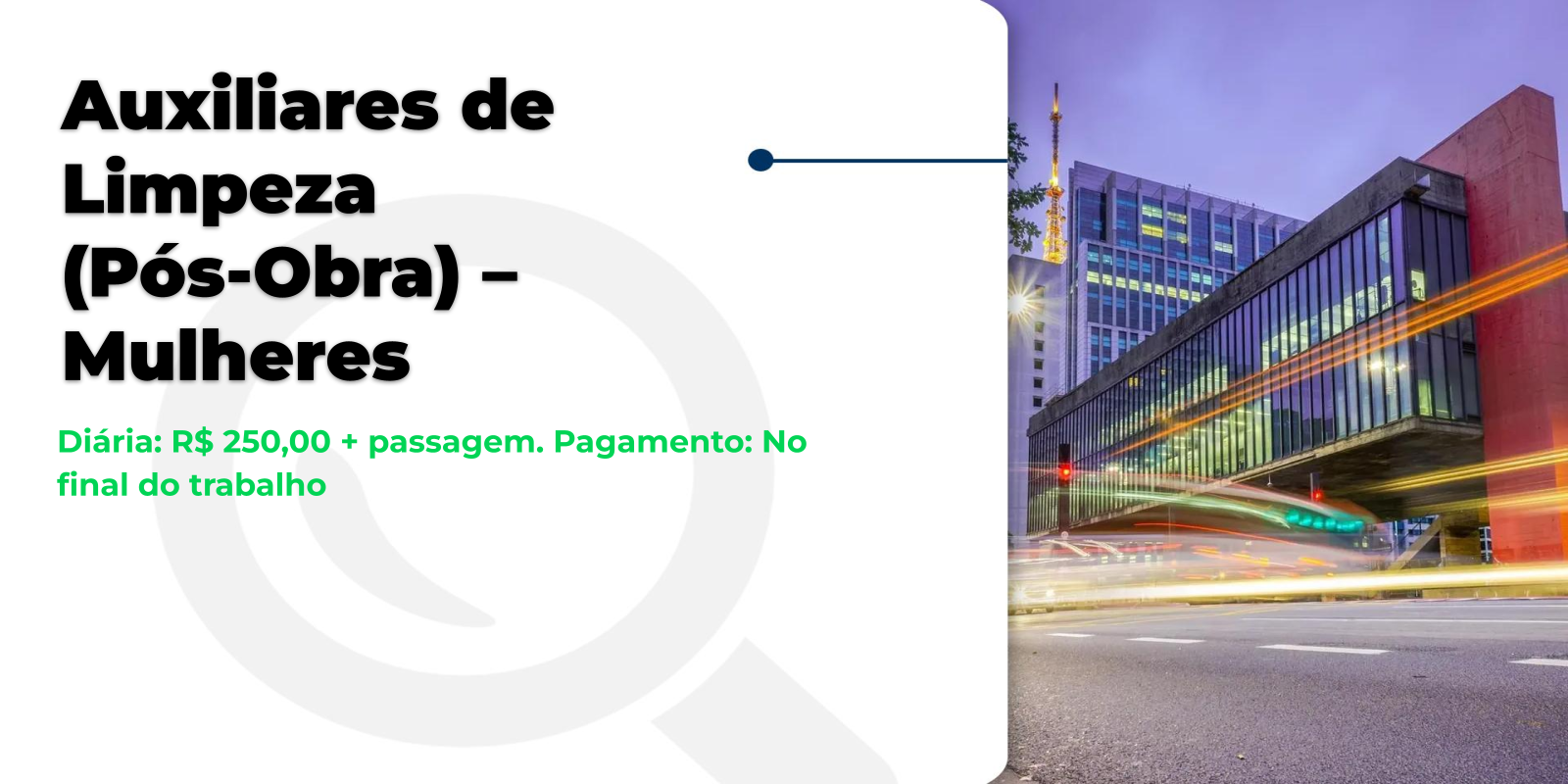 • Para se candidatar: Ser mulher e ter disponibilidade para os horários mencionados. É importante que você tenha disposição e energia para realizar as tarefas de limpeza pós-obra.